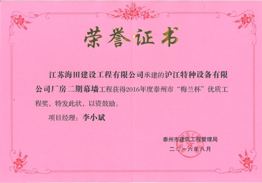 熱烈祝賀我公司承建的滬江特種設(shè)備有限公司廠房二期幕墻工程獲得2016年度泰州市“梅蘭杯”優(yōu)質(zhì)工程獎(jiǎng)